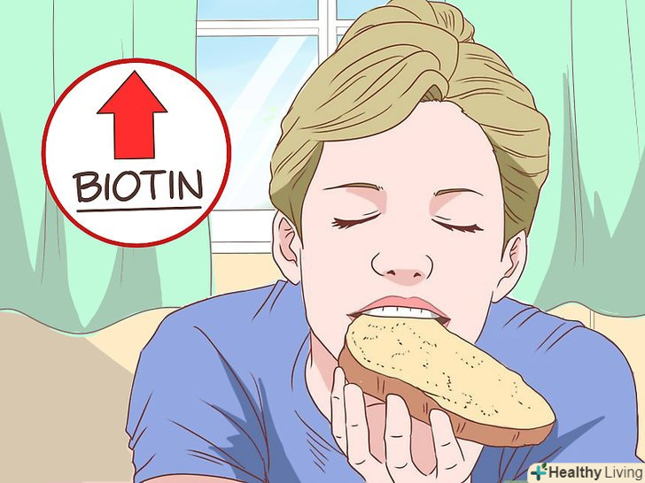 Спробуйте приймати біотин в таблетках. Біотин зміцнює нігті і сприяє їх росту. Ця речовина застосовується в самих різних випадках, від діабету до випадання волосся. Біотин також допомагає при ламкості нігтів. Завдяки цьому вітаміну нігті стають міцнішими і менше розшаровуються і ламаються. [3] Біотин міститься в продуктах, але частіше його приймають в таблетках.- Гарантій того, що біотин допоможе нігтям рости швидше, немає. Не існує наукових доказів того, що зростання нігтів можна прискорити за допомогою харчування або способу життя. Однак біотин зміцнить нігті і зробить їх щільніше. Якщо нігті рідше ламаються, вони можуть вирости довшими.