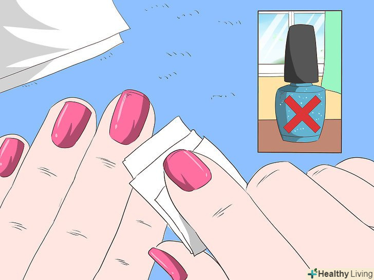 Не користуйтеся засобом для зняття лаку постійно. [4] кожен раз, коли ви стираєте лак, нігті послаблюються. Зробіть перерву і якийсь час не користуйтеся лаком і рідиною для зняття лаку. Фарбуйте нігті через тиждень або раз в три тижні. Завдяки цьому нігті стануть міцнішими.- Купіть лак, який буде триматися на нігтях довше. Якщо це неможливо, виберіть лак, який можна буде зафарбувати зверху іншим лаком, коли вам захочеться або коли вам набридне колір.