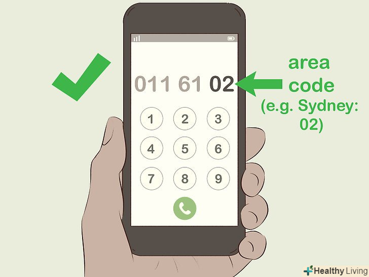 Дізнайтеся код міста або області, в яку збираєтеся дзвонити.це теж короткий код, 1-3 цифри. В Австралії є 5 різних кодів для різних областей. Перед номером 0 не набирається.[2]- Центральна Східна Австралія: 02