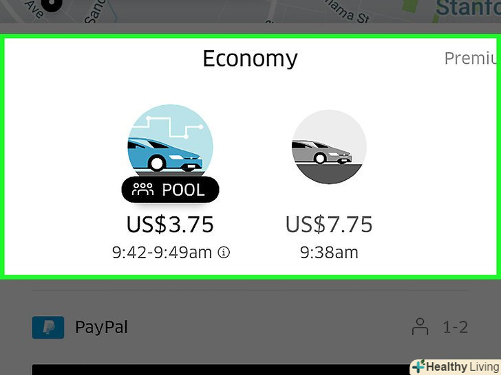 Виберіть тип автомобіля.у різних містах представлені різні версії сервісу Uber. Зазвичай можна вибрати Uber X, Uber XL, UberPool, Select та інші доступні варіанти. Проведіть пальцем зліва направо, щоб ознайомитися з пропонованими автомобілями, приблизним часом очікування і вартістю поїздки.- UberPOOL-сервіс, який дозволяє розділити вашу поїздку з незнайомцями, що значно знижує вартість послуги. Доступний не у всіх містах.