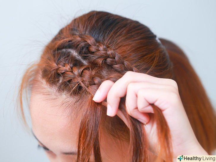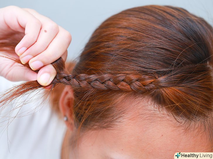 Підхоплюйте і заплітайте таким чином волосся до тих пір, поки не доберетеся до вуха. продовжуйте підчіплювати і вплітати 1/8 частини Центральної пасма, поки повністю не зберете всю центральну пасмо.- Після того, як у вас цілком збереться Центральна пасмо, продовжите плетіння звичайної коси, поки вона не стане досить довгою для того, щоб її можна було завести за вухо.