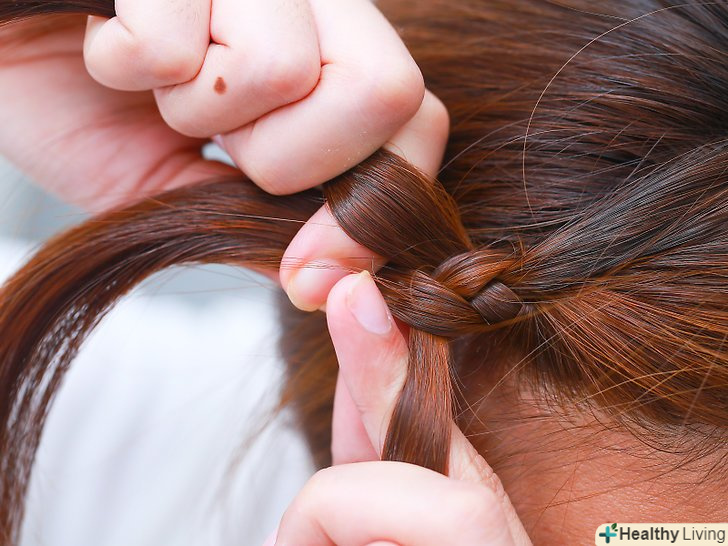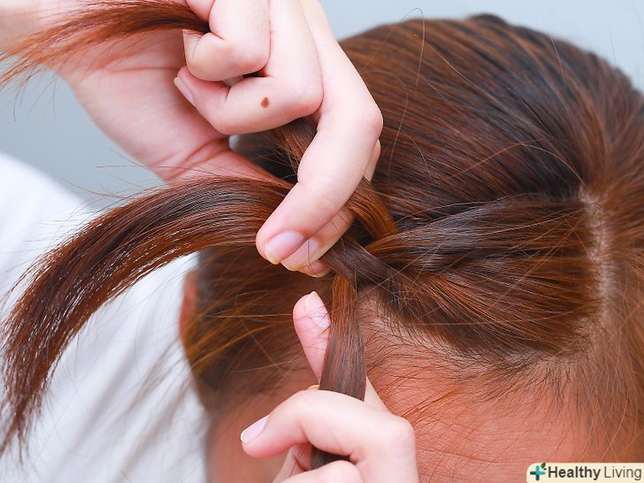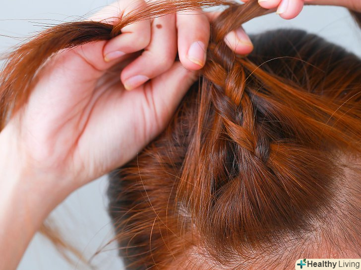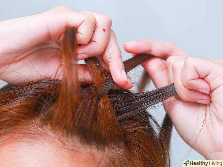 Виконайте повний перший ряд плетіння. використовуйте цілком волосся з бічних пасом, а з Центральної пасма візьміть лише частину волосся.- Виділіть частину волосся з Центральної пасма. Виділена частина повинна скласти приблизно 1/8 від всієї товщини центральної пасма і бути розташованої близько до місця плетіння.