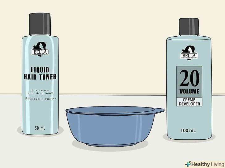 Підготуйте тонуючий засіб і нанесіть на волосся. нижче ми наводимо загальні рекомендації, тому обов'язково звіртеся з інструкцією виробника.- Змішайте 1 частину тонуючого засобу і 2 частини проявника 10 або 20 vol. Якщо у вас чорне волосся, спробуйте використовувати 40 vol., але пам'ятайте, що це дуже агресивний засіб, який може викликати опік. Якщо отримаєте хімічний опік, зверніться до лікаря!