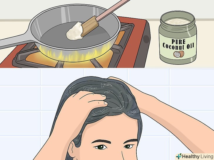 Нанесіть на волосся розплавлене кокосове масло і залиште на ніч. перед освітленням втирайте нерафіновану кокосову олію в шкіру голови і в волосся. Це дозволить захистити волосся від пошкоджень в процесі знебарвлення. Щоб отримати максимальний результат, потримайте масло на волоссі 14 годин. [5] не потрібно змивати волосся після знебарвлення.- Щоб не забруднити подушку маслом, оберніть голову рушником або заплетіть волосся і надіньте шапочку для душу.