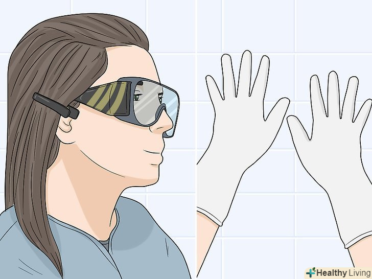 Захистіть шкіру, очі та одяг. при роботі з освітлювачем слід подумати про базові правила безпеки. Одягніть пластикові рукавички і захисні окуляри, старий одяг, а на підлогу покладіть щось, що не дасть йому забруднитися.- Можна також нанести тонкий шар вазеліну на лоб, вуха і шию. Якщо ви знебарвлюєте волосся, шкіру необов'язково захищати вазеліном як при звичайному забарвленні, проте вазелін може захистити її від роздратування, якщо освітлювач потрапить на лоб, вуха і шию.