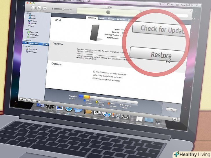 Налаштуйте iPod.коли процес відновлення завершиться, iTunes запустить помічника налаштування. Вас попросять назвати свій iPod і вибрати опції синхронізації. На цій стадії iPod можна вважати повністю відновленим. Синхронізуйте iPod з комп'ютером, щоб завантажити на нього музику.