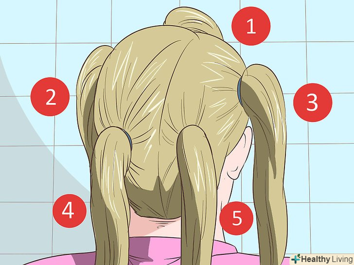 Зволожуйте волосся кілька разів на тиждень. підтримуйте волосся зволоженими протягом тижня. Спробуйте зволожувати волосся кожні 2-3 дні або як тільки помітите, що вони стали занадто сухими або неслухняними. Замість повноцінного зволоження можна на швидку руку просто розпустити волосся і скропити їх водою. Потім нанесіть незмивний кондиціонер по всій довжині і розчешіть локони, після чого втирайте оливкову олію для додаткового зволоження. [12]- Можна залишити волосся розпущеним або розділити їх на пасма як показано вище.