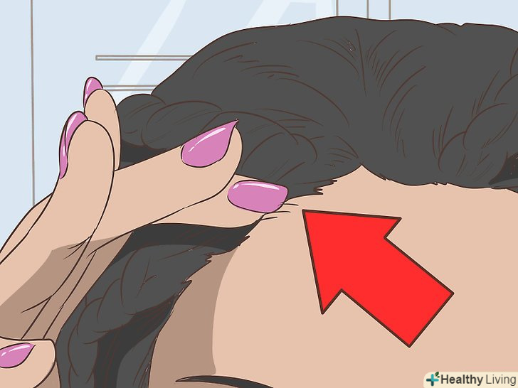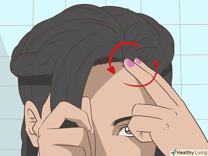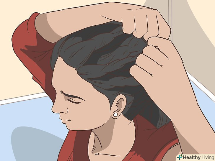 Розділяйте волосся на пасма і зволожуйте маслом. за допомогою шпильок для волосся розділіть волосся на 4-5 пасом. Один локон повинен спадати на лоб, а інші 3-4 пасма слід зачесати назад. Зволожуйте кожне пасмо волосся оливковою олією по всій довжині і біля коріння. [5]- Якщо не хочете використовувати оливкову олію, можна взяти будь-яке інше або кондиціонер. Наприклад, спробуйте застосувати касторове або мигдальне масло, масло жожоба або масло ши. [6]