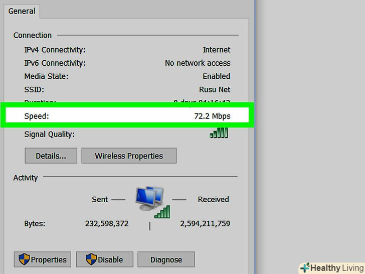 Подивіться на число, яке зазначено в рядку "швидкість". цей рядок розташований внизу розділу "Підключення «у вікні»стан: підключення по локальній мережі". Число (наприклад, 80 Мбіт/с) вказує на швидкість передачі даних між роутером і комп'ютером.