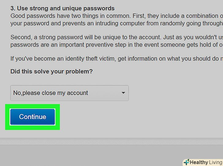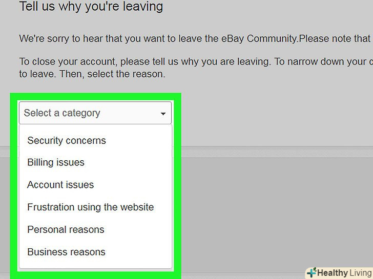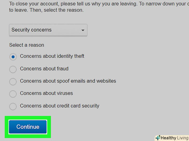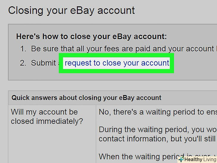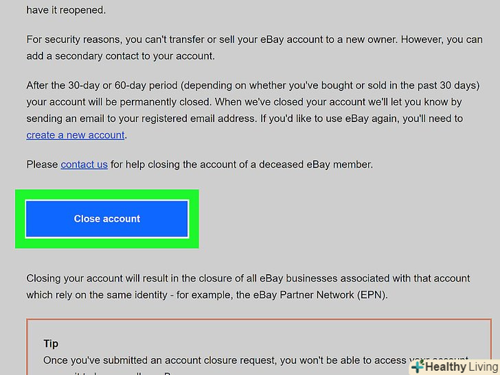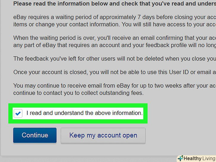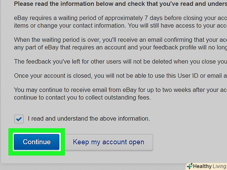 Клацніть поПродовжити.eBay приступить до процесу закриття вашого облікового запису. Пам'ятайте, що аккаунт може бути закритий протягом семи днів (але це максимальний термін).[1]