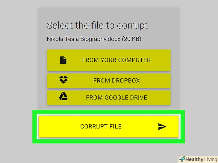 З цієї статті ви дізнаєтеся, як пошкодити файл за допомогою безкоштовного онлайн-сервісу. Навмисно пошкоджений файл може стати в нагоді в ряді випадків, найпоширенішим з яких є відправка нібито готового, але пошкодженого файлу вчителю, керівнику або клієнту, щоб виграти більше часу для роботи над документом.