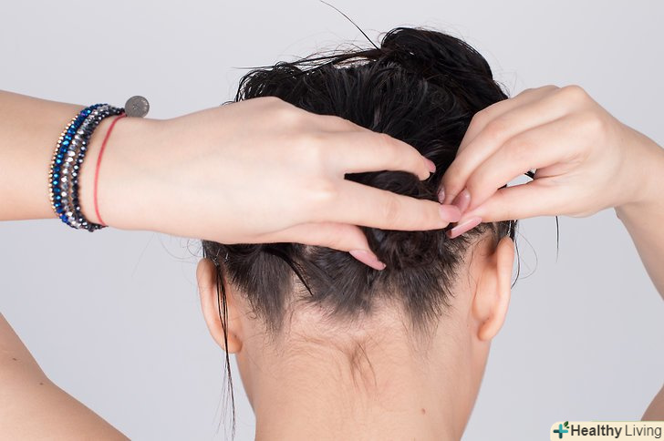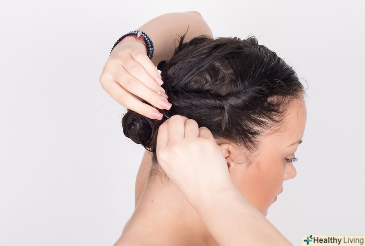 Оберніть кінчики волосся навколо гумки. однією рукою притримайте петлеподібний пучок волосся, а іншою рукою обмотайте вільні кінчики волосся навколо гумки, щоб замаскувати її. Візьміть дві-три шпильки, зачепіть ними кінчики волосся і застроміть під гумку. [19]- Перехресне закріплення пучка шпильками надає йому додаткову міцність фіксації.