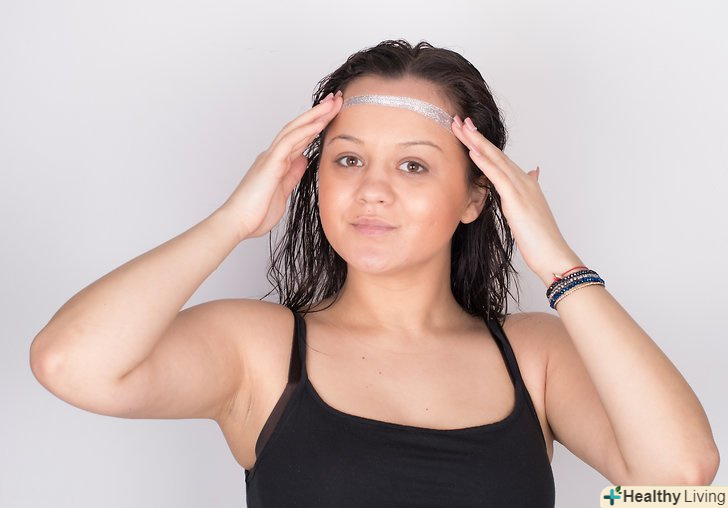 Одягніть на голову поверх волосся еластичну пов'язку для голови. розтягніть її обома руками, щоб надіти на голову аналогічно тому, як зазвичай надівається капелюх. [14] виправте положення пов'язки спереду, щоб вона лежала так, як вам подобається. Задня частина пов'язки обов'язково повинна лежати поверх волосся.