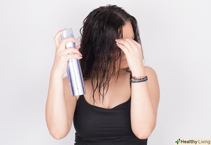 Обробіть волосся засобом для полегшення розчісування. даний засіб пом'якшить сплутані ділянки волосся, і ви без зусиль зможете прочесати їх пальцями. Піднесіть балончик із засобом до голови (тримайте його на відстані близько 15 см від голови) і розпорошите його на волосся 4-6 разів. [1] Якщо у вас довгі або хвилясте волосся, то можна трохи сильніше обробити їх засобом.- Засіб обов'язково має проникнути не тільки у верхні шари волосся, але і у внутрішні.