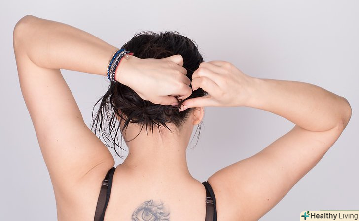 Зав'яжіть низький кінський хвіст і на останньому кроці сформуйте з нього петлю. зберіть волосся біля основи шиї. Почніть зав'язувати кінський хвіст гумкою для волосся. На останньому обороті гумки виведіть з неї хвіст лише наполовину. Так у вас вийде петля з волосся, кінчики яких залишаться зафіксованими під гумкою в підставі кінського хвоста. [18]- Довжина стирчать з-під гумки кінчиків волосся повинна скласти 5-8 см.