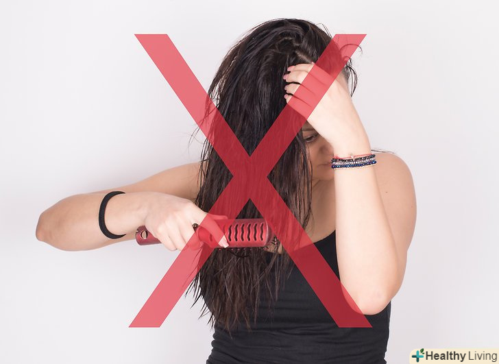 Намагайтеся не розчісувати мокре волосся. коли волосся намокає, вони стають слабкими і легко травмуються. Тому для розплутування мокрого волосся краще не користуватися гребінцем-щіткою. Замість цього розплутайте пасма пальцями або (в разі необхідності) візьміть плоску гребінець з рідкісними зубчиками. Так ви завдасте менше шкоди мокрому волоссю. [26]