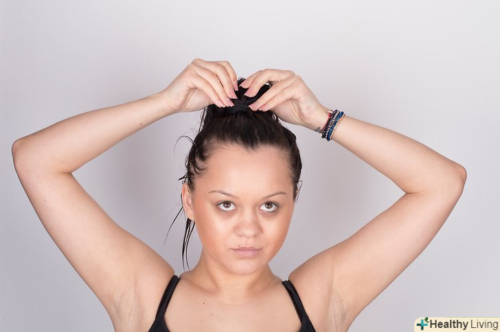 Зберіть волосся ззаду, щоб потім можна було зробити кінський хвіст. Коли ваше волосся будуть більш-менш розплутані, зачешіть їх назад, щоб зібрати їх у високий кінський хвіст на маківці. Якщо ваше волосся все ще залишаються дуже мокрими, то можна просто зібрати їх пальцями. [2]- Для підхоплення випадають з кінського хвоста пасом і розгладження півнів використовуйте гребінець-щітку.