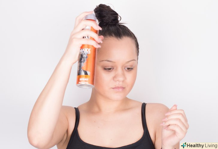 Обробіть волосся лаком для волосся. злегка обробіть верхній шар волосся лаком для волосся, щоб зачіска краще трималася і волосся не починали пушіться. [6] злегка проведіть руками по голові, щоб пригладити волосся.- В тому числі не забудьте обробити волосся лаком ззаду, щоб більш короткі пасма не почали випадати з пучка.