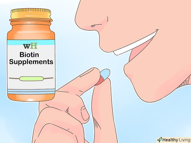 Добавки з біотином. Біотин-це вітамін групи B тваринного походження, який зміцнює волосся, шкіру і нігті. [3] Біотин може входити до складу засобів для волосся. Приймайте добавки з біотином або збільште споживання печінки, інших м'ясних продуктів, а також волоських горіхів і зелені.