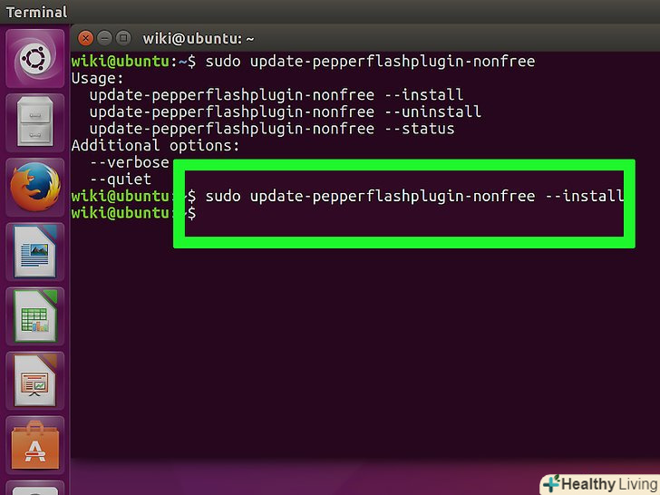 - Введітьsudo update-pepperflashplugin-nonfree –install натисніть ↵ Enter, щоб встановити оновлення.
