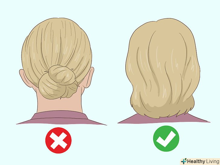 Вибирайте прості зачіски. намагайтеся уникати складних зачісок з начосом і складним плетінням, які натягують, згинають або ламають волосся. Не використовуйте гумки, шпильки або шпильки. Волоссю після знебарвлення потрібен час, щоб відновитися, тому краще носити їх розпущеним. [13]- Якщо вам необхідно перев'язати волосся, використовуйте м'яку широку гумку, яка не залишає слідів або вм'ятин на волоссі. Гумки, після яких залишаються сліди, пошкоджують волосся.