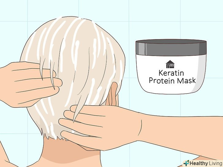 Якщо дозволяють кошти, зробіть протеїнову маску для волосся в салоні-перукарні. протеїнова маска зміцнить волосся, і вони будуть менше сіктися. Професійні Протеїнові маски, які є в асортименті салонів краси і перукарень, більш ефективні, ніж маски для домашнього використання. Крім того, перукар зможе підібрати маску, відповідну вашому типу волосся. Чим раніше після знебарвлення Ви вдасться до цієї процедури, тим краще ваше волосся будуть захищені від пошкоджень. [7]- Більшість салонів-перукарень пропонують широкий спектр засобів для догляду за волоссям. Після першої інтенсивної процедури можна щомісяця робити в салоні живильні Протеїнові або зволожуючі маски для підтримки здоров'я волосся. Обговоріть зі своїм майстром найбільш оптимальну схему зміцнення і харчування волосся.
