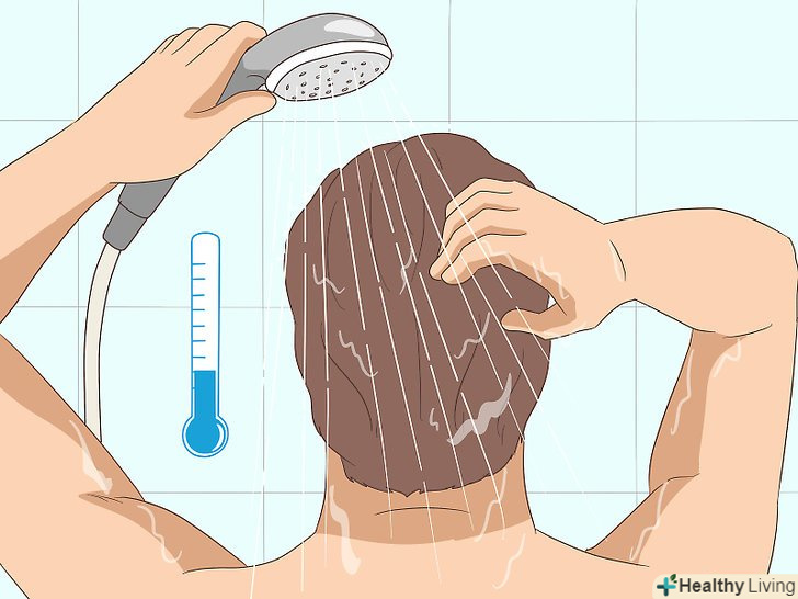 Обполіскуйте волосся прохолодною водою. після того як ви помиєте волосся шампунем і кондиціонером, обполосніть їх прохолодною водою. Прохолодна вода зміцнює волосяні фолікули. Завдяки цьому після душу випадає значно менше волосся. [3]