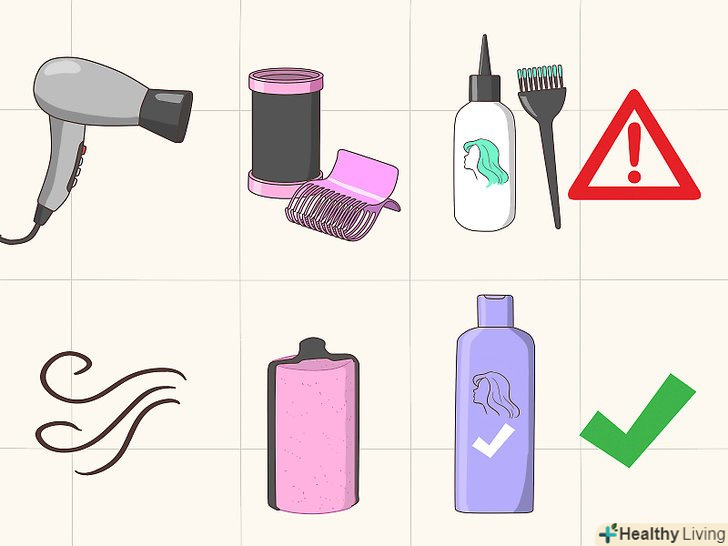 Зведіть до мінімуму вплив тепла і фарби для волосся. тепловий вплив або фарбування з часом пошкоджує волосся. Тому, коли є така можливість, не використовуйте фен, дозволяючи волоссю висохнути природним чином. Замість термобігуді використовуйте звичайні, наприклад поролонові або»бумеранги". Намагайтеся фарбувати волосся рідше і після фарбування користуйтеся шампунем для фарбованого волосся. [4]