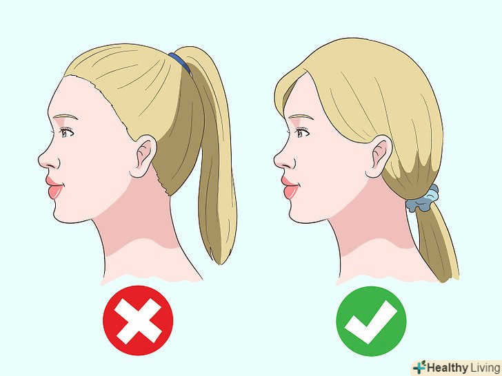 Правильно зав'язуйте хвіст. не стягуйте волосся в тугий хвіст на маківці — від цього волосся можуть ламатися. Замість цього збирайте волосся у вільний хвіст або ходите з розпущеним. Уникайте гумок для волосся. Час від часу змінюйте положення хвоста, щоб Ваше волосся не ставали занадто ламкими в одній області. [6]