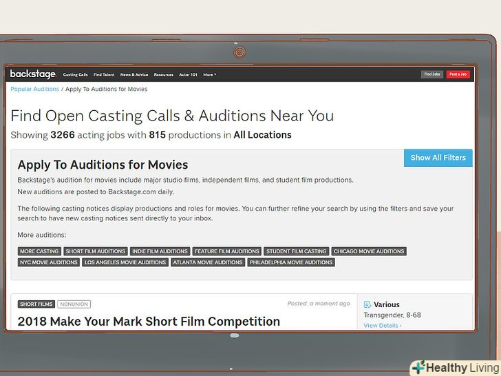 Знайдіть прослуховування.найпростіший спосіб знайти прослуховування-пошук в Інтернеті. Ви також можете перевірити розділ оголошень у місцевій газеті або дошки оголошень на сайтах навчальних закладів, навчальних кінематографії: на останніх ви можете знайти кастинги для зйомок у студентських фільмах.- Найбільше прослуховувань проводиться в столицях. Однак буває, що і менш великі міста мають свою кіноспільноту, і ви обов'язково знайдете можливості, якщо будете знати, де шукати. Щоб знайти більше інформації, зверніться до блогів про мистецтво, альтернативних щотижневих газет та інших публікацій з відповідної тематики.