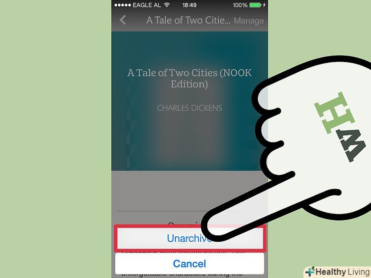 Виберіть в меню опцію "Unarchive"("Розархівувати").натискання у випадаючому меню Опції "Unarchive" ("Розархівувати") призводить до вилучення книги з архіву і повернення її на ваш пристрій. Після цього ви знову зможете читати її, проте вона займе деякий обсяг пам'яті на пристрої.- Знайти розархівовану книгу ви зможете в бібліотеці свого пристрою Nook[3].