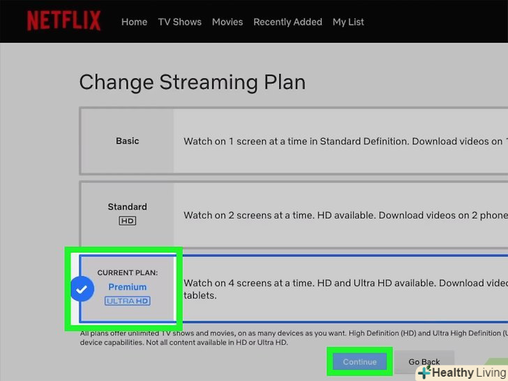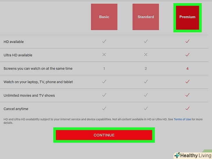 Виберіть план і натиснітьCONTINUE (продовжити).ціни залежать від країни, але існують всього три плани:» Basic «(базовий),» Standard «(стандартний) і» Premium " (преміальний).[2]- Базовий план дозволить дивитися відео стандартної чіткості (SD) на одному екрані.