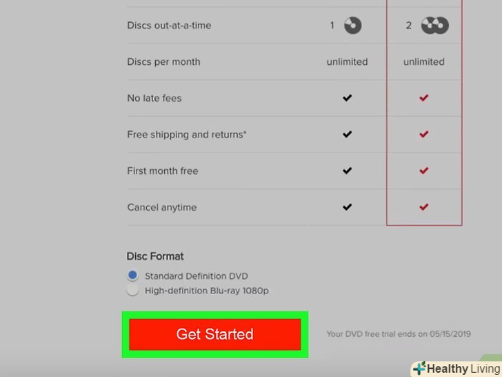 Виберіть план оренди DVD-дисків.стандартний і преміальні плани дозволяють орендувати необмежену кількість дисків. Різниця лише в тому, що в стандартному плані за раз можна орендувати тільки один диск, а в преміальному плані — відразу два диска.- Якщо ви хочете орендувати не тільки DVD, але і Blu-ray-диски, встановіть прапорець у опції «Yes, I want to include Blu-ray "(так, включити Blu-ray).