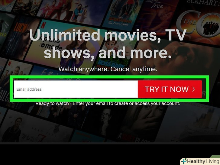 Введіть свою адресу електронної пошти та натиснітьTry 30 Days Free (30 днів безкоштовного користування).нові користувачі мають право на безкоштовну 30-денну пробну версію сервісу. Ця опція може називатися по-іншому (в залежності від пристрою, на якому Ви реєструєтеся), але безкоштовна пробна версія сервісу доступна на комп'ютерах, мобільних пристроях і розумних телевізорах.- Навіть якщо ви підписуєтеся на безкоштовну пробну версію, вам доведеться ввести спосіб оплати, але протягом пробного періоду гроші стягуватися не будуть. Щоб запобігти списанню грошей з рахунку, закрийте аккаунт до закінчення 30 днів.