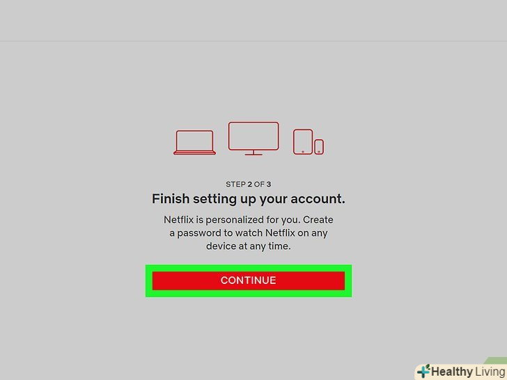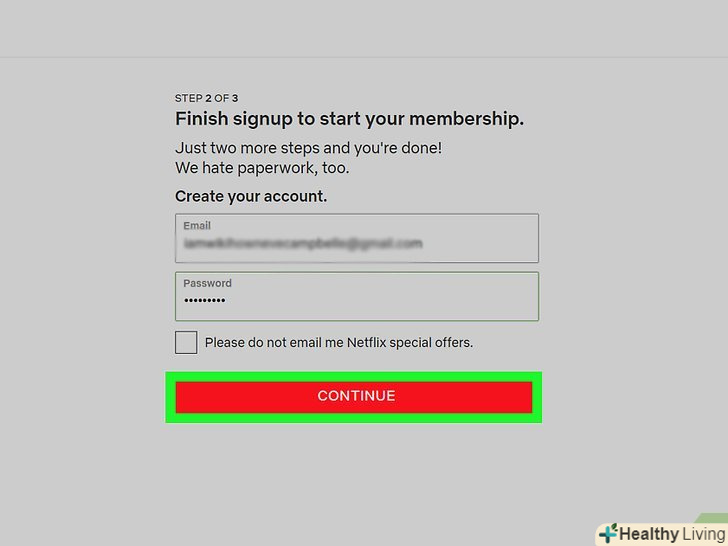 Введіть пароль і натиснітьCONTINUE (продовжити). Ваша адреса електронної пошти повинна відобразитися в полі "Email" — Електронна пошта) - якщо ні, введіть її. Ця електронна адреса та пароль будуть використовуватися для входу до вашого облікового запису Netflix.