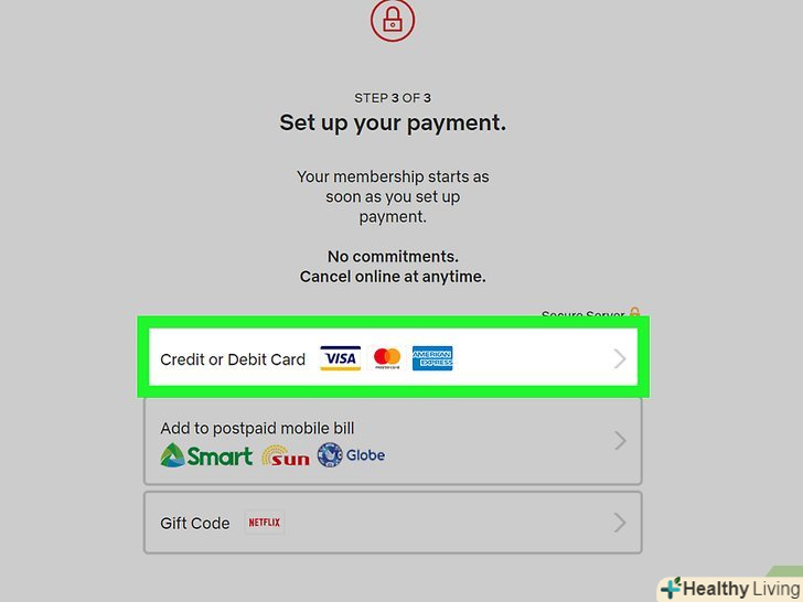 Виберіть спосіб оплати.якщо у вас є подарункова карта Netflix, виберіть "Gift Code" (подарунковий код). В іншому випадку натисніть " Credit or Debit Card "(банківська карта), щоб ввести дані карти, або клацніть по " PayPal "(якщо він працює у вашій країні), щоб увійти в PayPal.