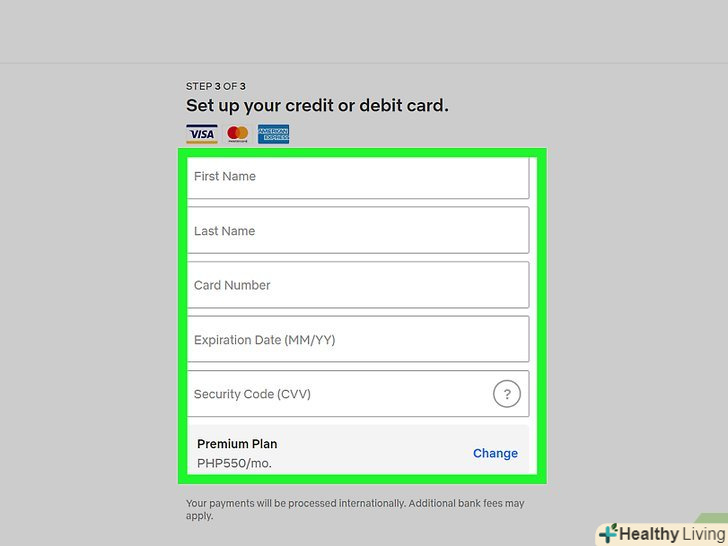 Введіть платіжні дані.для цього заповніть форму на екрані. Якщо Ви користуєтеся PayPal, дотримуйтесь інструкцій на екрані, щоб увійти в свій обліковий запис і підтвердити спосіб оплати.