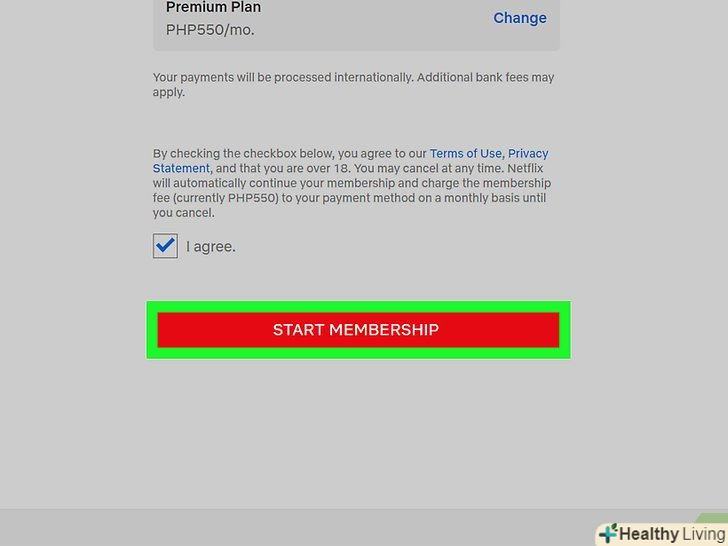 Клацніть поSTART MEMBERSHIP (стати учасником).так ви активуєте безкоштовну 30-денну пробну версію Netflix. Коли зазначений термін закінчиться і ви вирішите продовжити користуватися Netflix, додаткові кроки робити не потрібно. Якщо ж ви хочете відмовитися від послуг Netflix, закрийте аккаунт до настання останнього дня пробного періоду.- Щоб закрити обліковий запис, відкрийте сайтhttps://www.netflix.com, клацніть по значку профілю у верхньому правому куті, виберіть «Account» (Аккаунт), натисніть «cancel Membership» (закрити членство) і дотримуйтесь інструкцій на екрані.