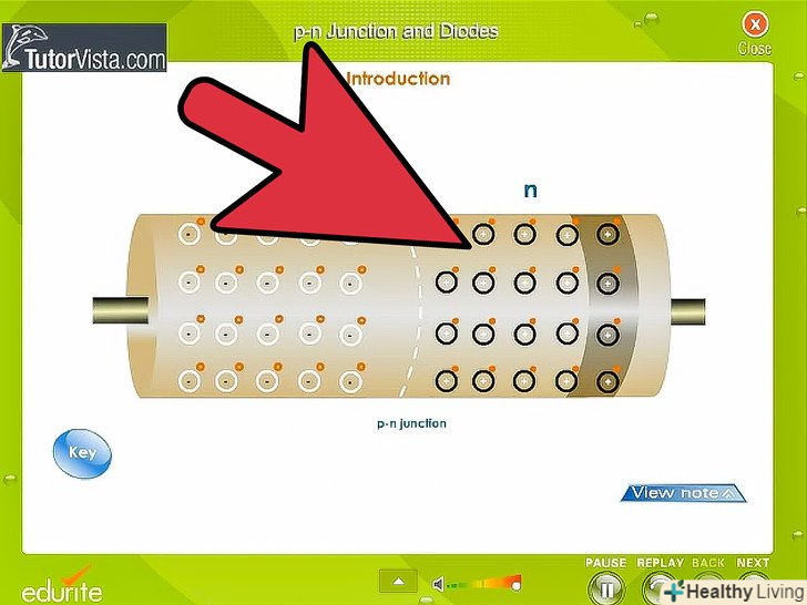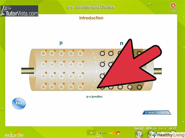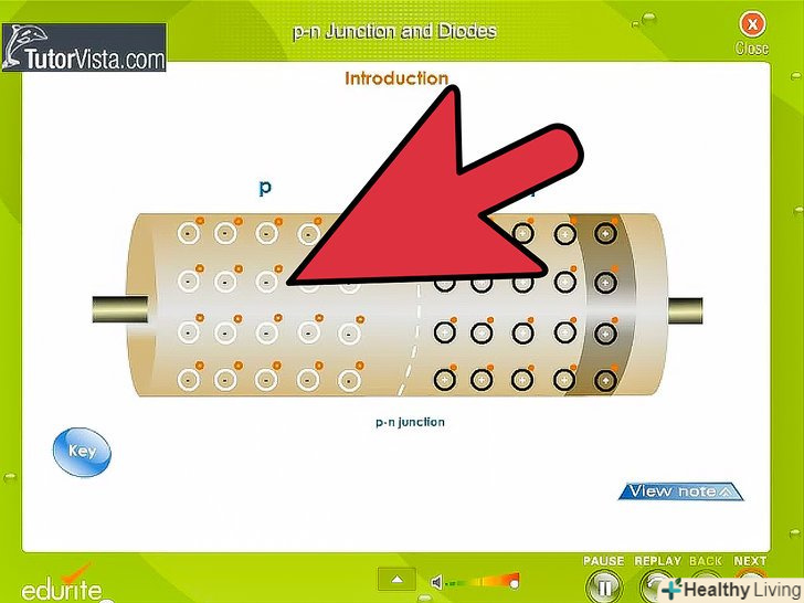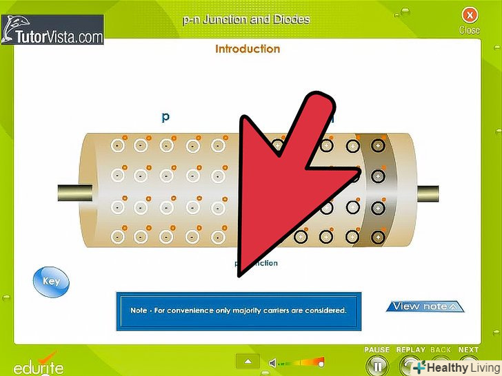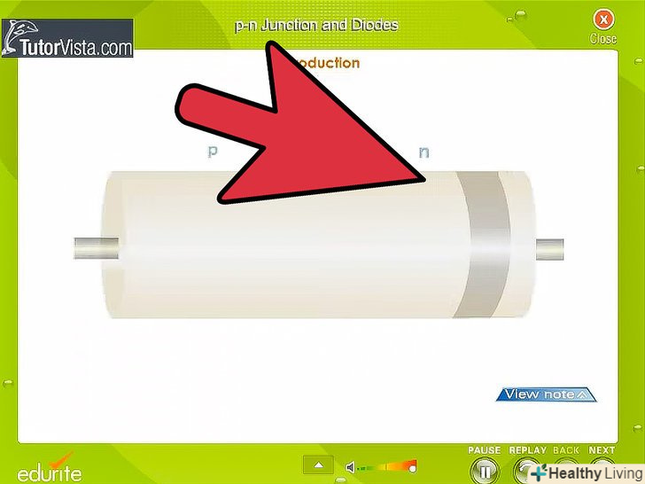 Вивчіть принцип роботи діода.діод складається з напівпровідників p - і n-типу. Напівпровідник n-типу відповідає за негативну сторону діода і називається катодом. Напівпровідник р-типу є позитивною стороною діода і називається анодом.- Якщо позитивна сторона джерела напруги з'єднана з позитивною стороною діода (анодом), а негативна сторона з'єднана з негативною стороною (катодом), то діод буде проводити струм.
