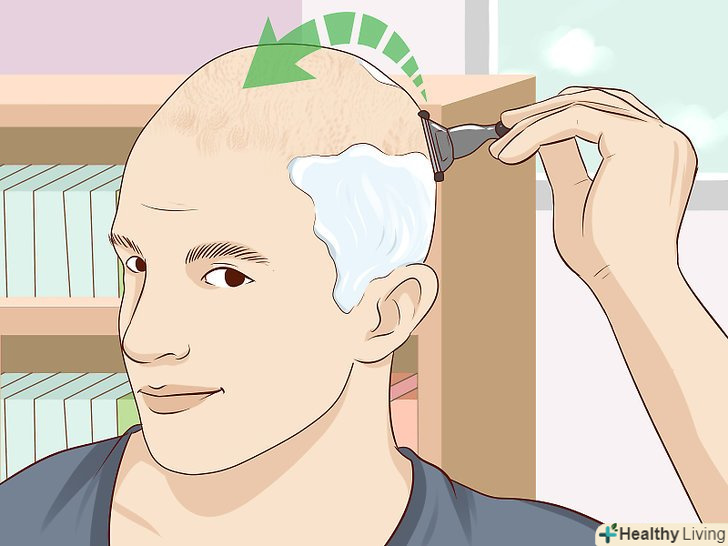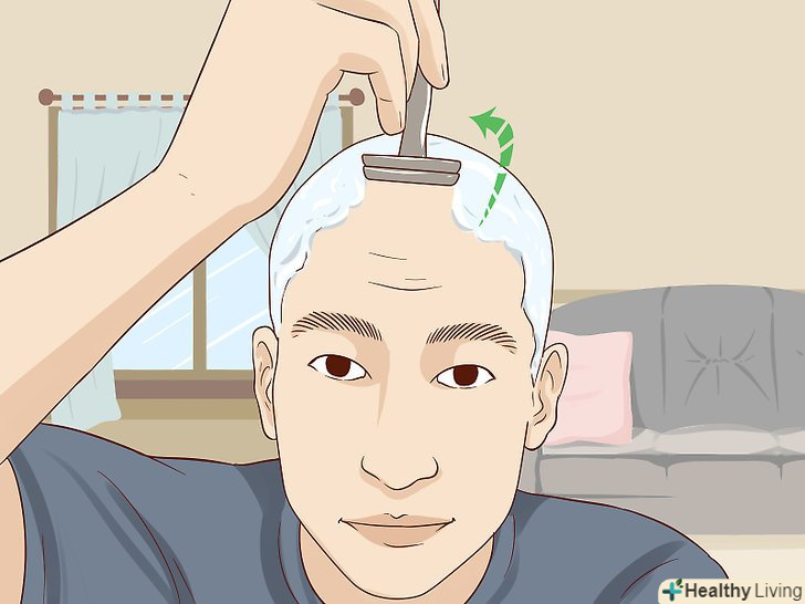 Почніть з гоління верхньої частини голови. волосся у верхній частині голови зазвичай більш тонкі, тому їх легше голити. Приставте лезо бритви до верхівки, а потім проведіть бритвою по шкірі в напрямку до чола. Продовжуйте працювати рівномірними рухами бритви до тих пір, поки не збрієте всю верхню частину волосся. [12]- На додаток до того, що волосся зверху зазвичай більш тонкі, цю зону простіше розглянути в дзеркало, ніж потиличну область. Завжди краще починати гоління з найлегшою зони, так як це дозволить вам виробити відповідний ритм роботи.
