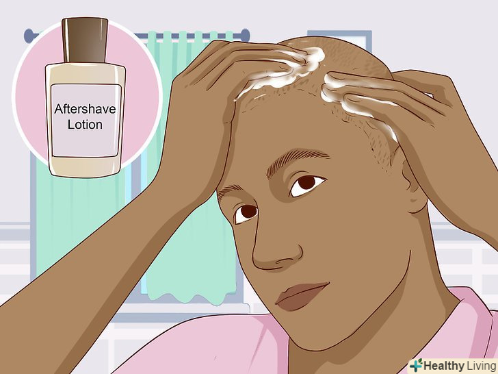 Щоб зменшити подразнення шкіри, скористайтеся засобом після гоління. зупиніть свій вибір на лосьйоні або бальзамі після гоління, якщо такі є. Ці кошти більше підходять для чутливої шкіри голови, ніж інші типи засобів. Проте, краще скористатися будь-яким наявним засобом після гоління, ніж взагалі обійтися без нього. [18]- Якщо ви збираєтеся часто голити голову, розумно буде витратитися на засіб після гоління, спеціально призначене для шкіри голови. Його можна пошукати в товарах для гоління в місцевих магазинах косметики або в інтернет-магазинах.