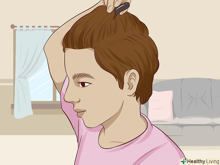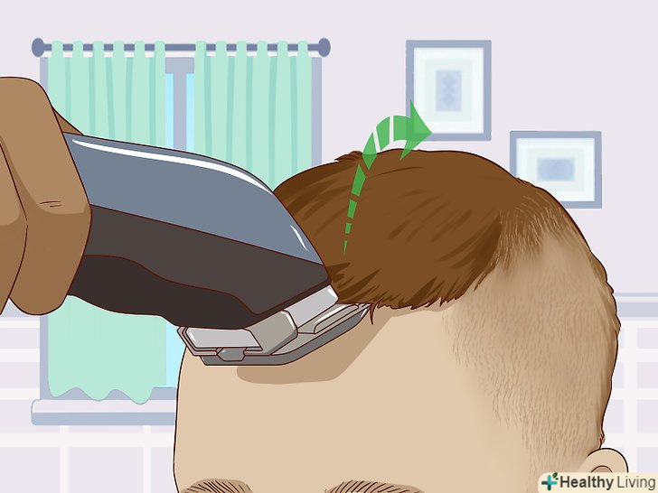 Поголіть верхню частину голови в напрямку від чола назад. прикладіть машинку лезами до лінії росту волосся на лобі. Потім повільно проведіть нею назад в сторону потилиці. Зупиніться, коли досягнете верхівки. [4]