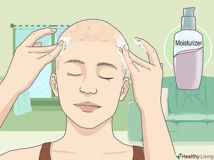 Обробляйте шкіру голови зволожуючим засобом мінімум по два рази на день. Допустимо використовувати зволожуючий засіб для обличчя або тіла, але найкраще застосовувати той засіб, який спеціально призначений для захисту шкіри голови. Наносите його вранці і вечорами, особливо після душу. [22]- Зволожуючий засіб дозволяє запобігти утворенню сухих і зморшкуватих ділянок шкіри. Крім того, воно допомагає голові зберігати свіжовибритий вигляд більш тривалий час.