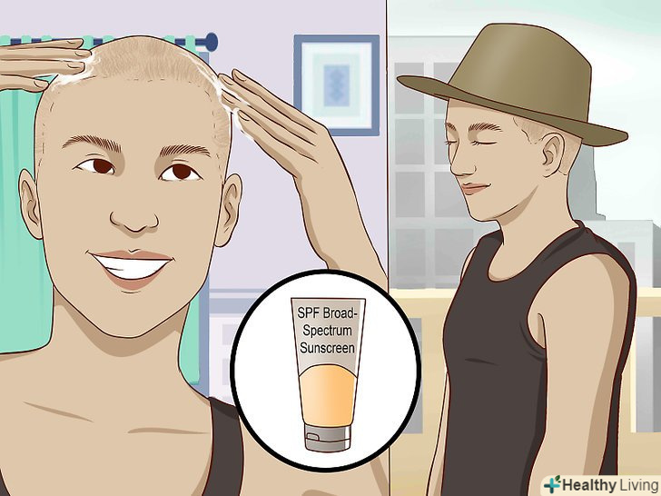Захищайте голову від ультрафіолету сонцезахисним засобом або капелюхом. Виберіть для себе сонцезахисний засіб широкого спектру захисту і наносите його мінімум за 15 хвилин перед виходом з дому. Повторно наносите сонцезахисний засіб кожні 2-4 години перебування на вулиці. В якості альтернативи для захисту від сонця можна носити капелюх. [23]- Голена голова вкрай беззахисна під впливом сонця, яке може викликати опіки, больові відчуття і навіть спровокувати розвиток раку шкіри.