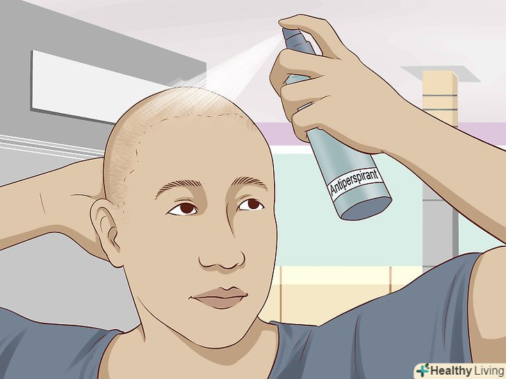 Якщо у вас є проблема з надмірним потовиділенням, обробляйте шкіру голови антиперспірантом перед відходом до сну. зазвичай саме волосся вбирають в себе крапельки поту, що виділяються шкірою голови в процесі природного потовиділення. При відсутності волосся поту просто нікуди подітися. Але на щастя, антиперспірант дозволяє полегшити проблему, якщо вас сильно турбує потовиділення. Просто наносите його на шкіру голови перед сном, щоб воно встигло вбратися в шкіру. [24]- Для шкіри голови краще використовувати антиперспірант у вигляді спрею, але також допустимо застосовувати кульковий антиперспірант або антиперспірант у вигляді олівця, якщо у вас нічого іншого немає під рукою.