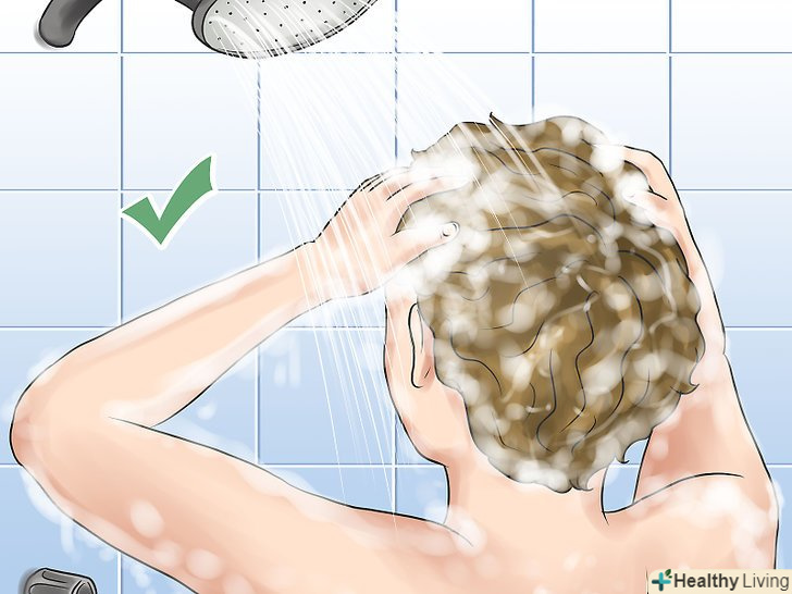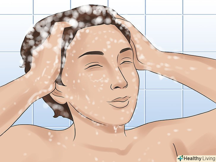 Змийте шампунь і нанесіть бальзам-ополіскувач. через кілька хвилин ретельно змийте весь шампунь теплою водою. Після цього нанесіть бальзам-ополіскувач і ще раз промийте волосся холодною водою. [11]
