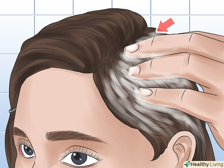 Нанесіть шампунь на волосся. коли ви розділите волосся на секції, можна починати наносити шампунь. Почніть з зон, які потребують найбільшої тонування і найбільш стійкі до обробки, і поступово переходите до інших зон. Переконайтеся, що нанесли шампунь на все волосся, щоб результат вийшов рівномірним. [9]- На сухе волосся потрібно наносити більше шампуню, ніж на вологі. Використовуйте кількість, достатню для повного покриття волосся. Майте на увазі, що без води шампунь буде менше пінитися.