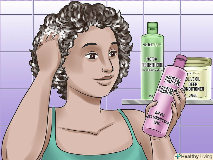 Зволожуйте волосся протеїнами. засоби з протеїнами покращують стан волосся за рахунок обволікання волосяної фолікули і волосяного стрижня. Це дозволяє не допустити подальшого пошкодження. Протеїни також на час заповнюють пошкоджені ділянки волосяного стрижня. [12]- Якщо волосся сильно пошкоджені, використовуйте засіб для реконструкції волосся. Коли стан волосся покращиться, перейдіть на засіб, який буде проникати глибоко в волосся. [13]