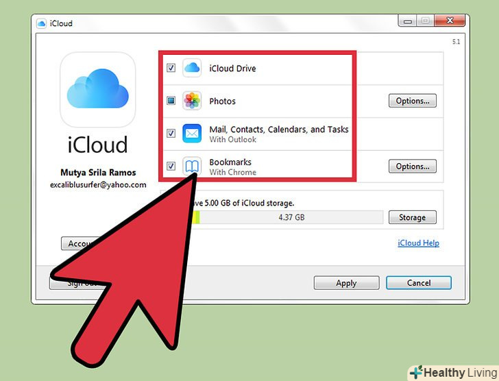 Поставте прапорці у тих функцій iCloud, які потрібно включити.Такими функціями є "Фото», «Пошта», "контакти" і так далі.