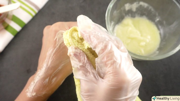 Обполосніть шкіру водою і надіньте рукавички, якщо хочете захистити руки. якщо ви намагаєтеся змити фарбу з рук, то їх не потрібно закривати, але непогано буде використовувати рукавички в тому випадку, коли ви збираєтеся позбутися від плям фарби у лінії росту волосся і на шкірі голови. [1]Рада: якщо фарба пофарбувала шкіру голови і лінію росту волосся, почекайте, поки не завершиться процес фарбування волосся, перш ніж видаляти плями фарби з шкіри.